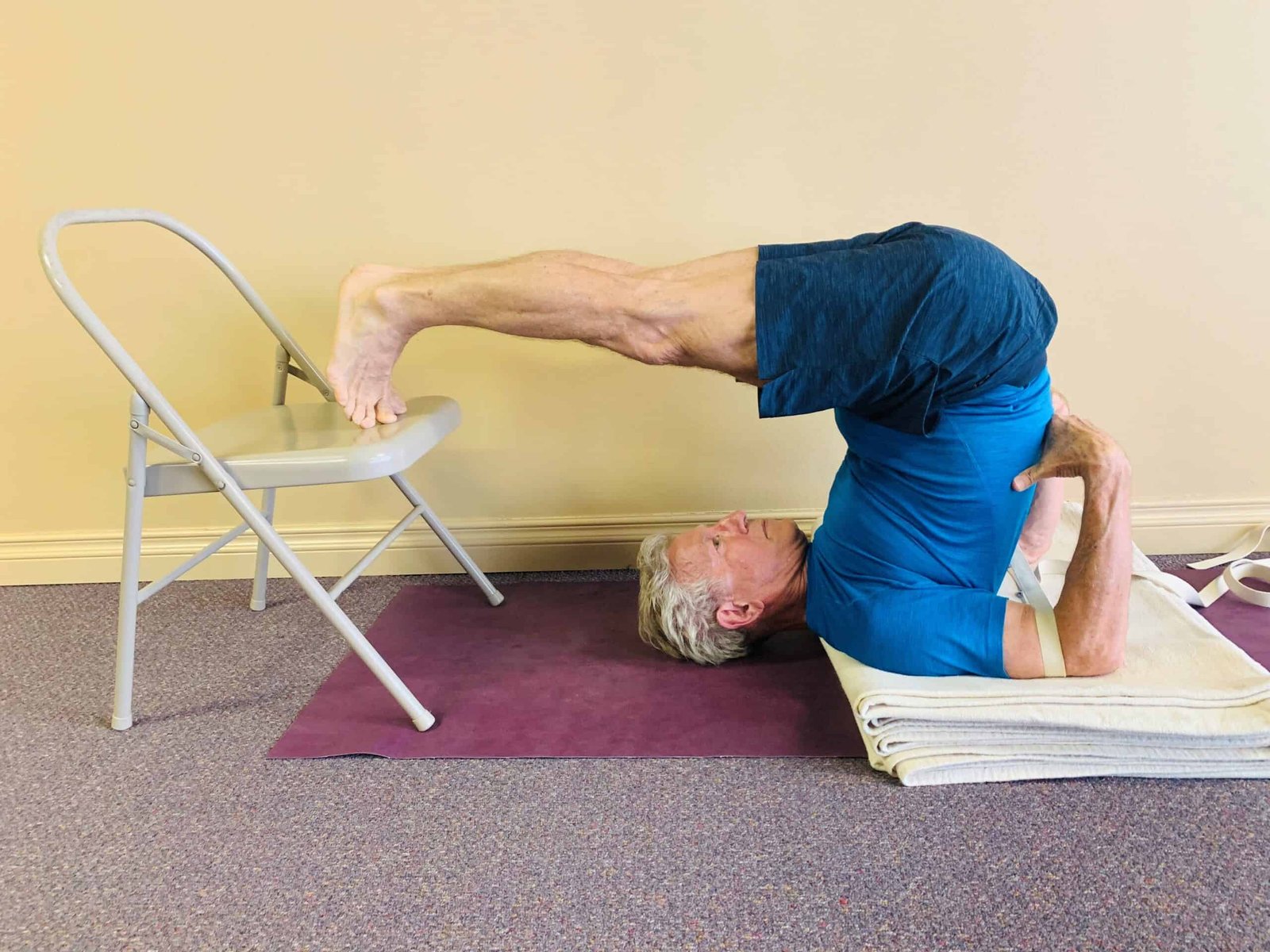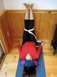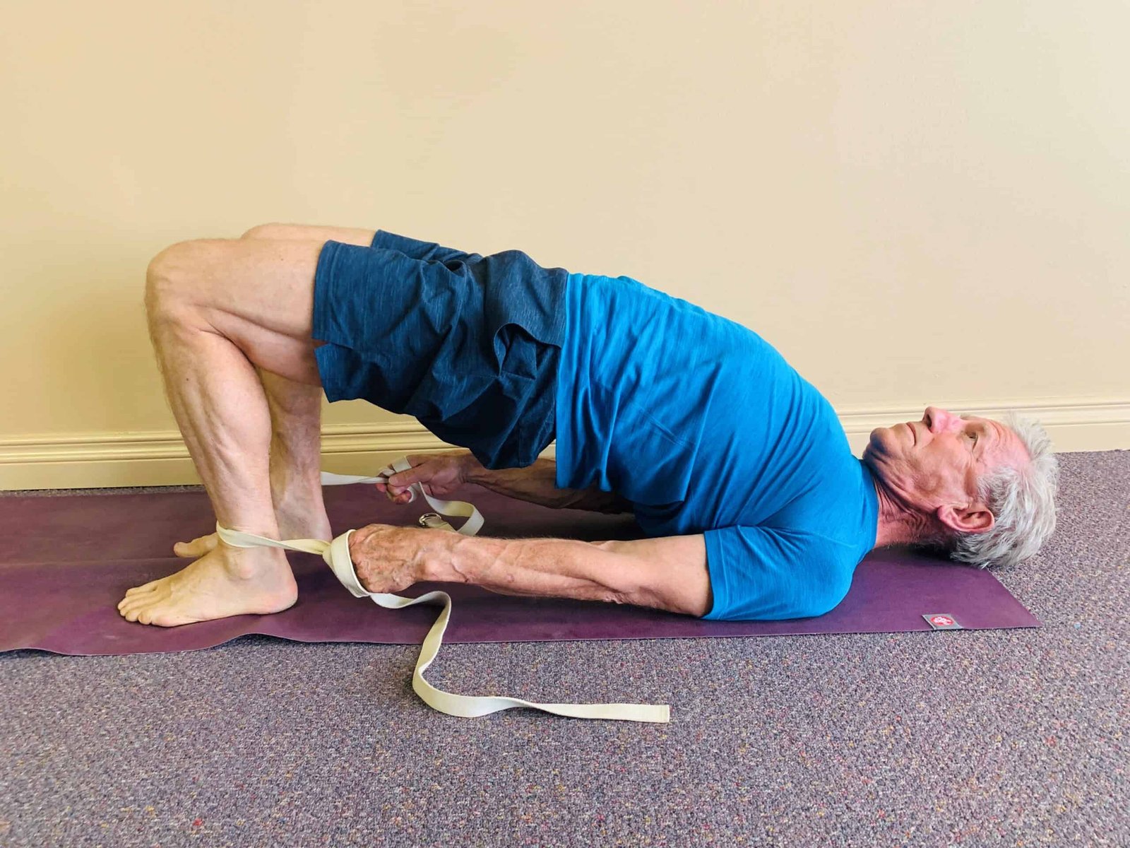 Yoga Straps can be used strapping the legs too. With poses such a Viparita Karani (legs up the wall), a single looped strap mid thigh will help secure the legs. This strap brings attention to the legs and helps support them during the pose. A strap on mid thighs in Setu Bandha Sarvangasana (a reclining back bend done through a yoga chair) will keep the legs together and prevented from rolling out. This adaptation can be used as a variation where appropriate in a restorative practice or anytime. It just feels good!