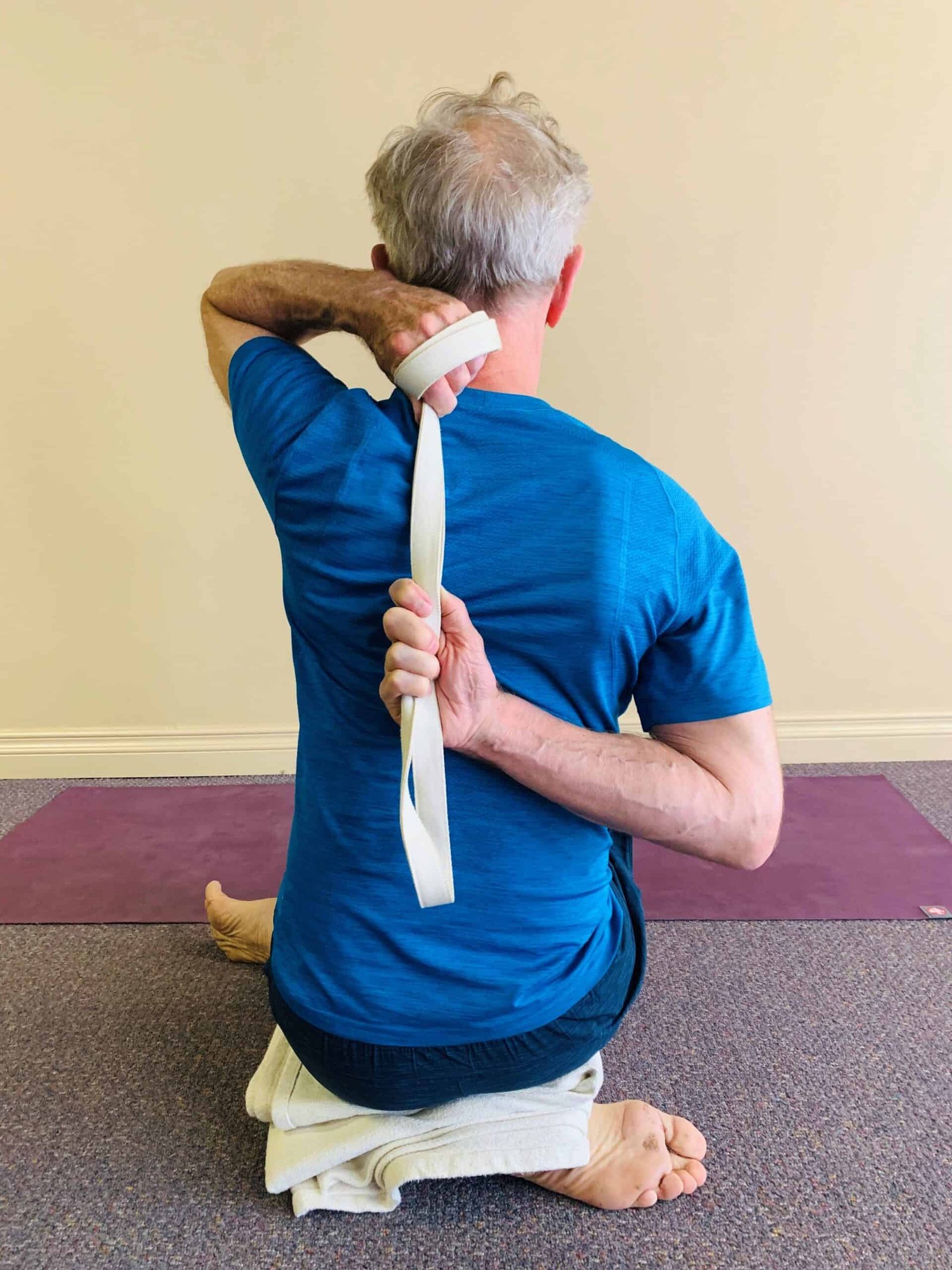 Another popular use for Yoga Straps is as a brace to support good posture for the shoulders, providing feedback on what good posture feels like. This “strap jacket” worn during the class or sitting at a desk will remind you to maintain good posture.